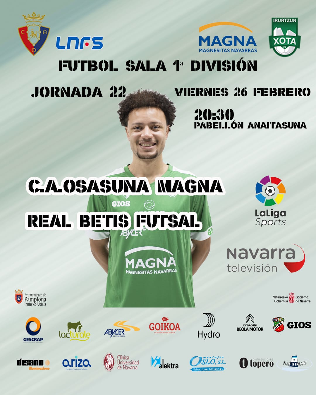 Después de haber conseguido dos victorias consecutivas como visitante en las pistas de Jaén y Tudela, C.A. Osasuna Magna quiere refrendar su buen momento en el partido de liga que se disputa este viernes en el Pabellón Anaitasuna ante el Real Betis Futsal. Los sevillanos están siendo el equipo revelación de la temporada y llegan a Pamplona con 29 puntos en su casillero y colocados en puesto de play off, en su debut en la máxima categoría.
