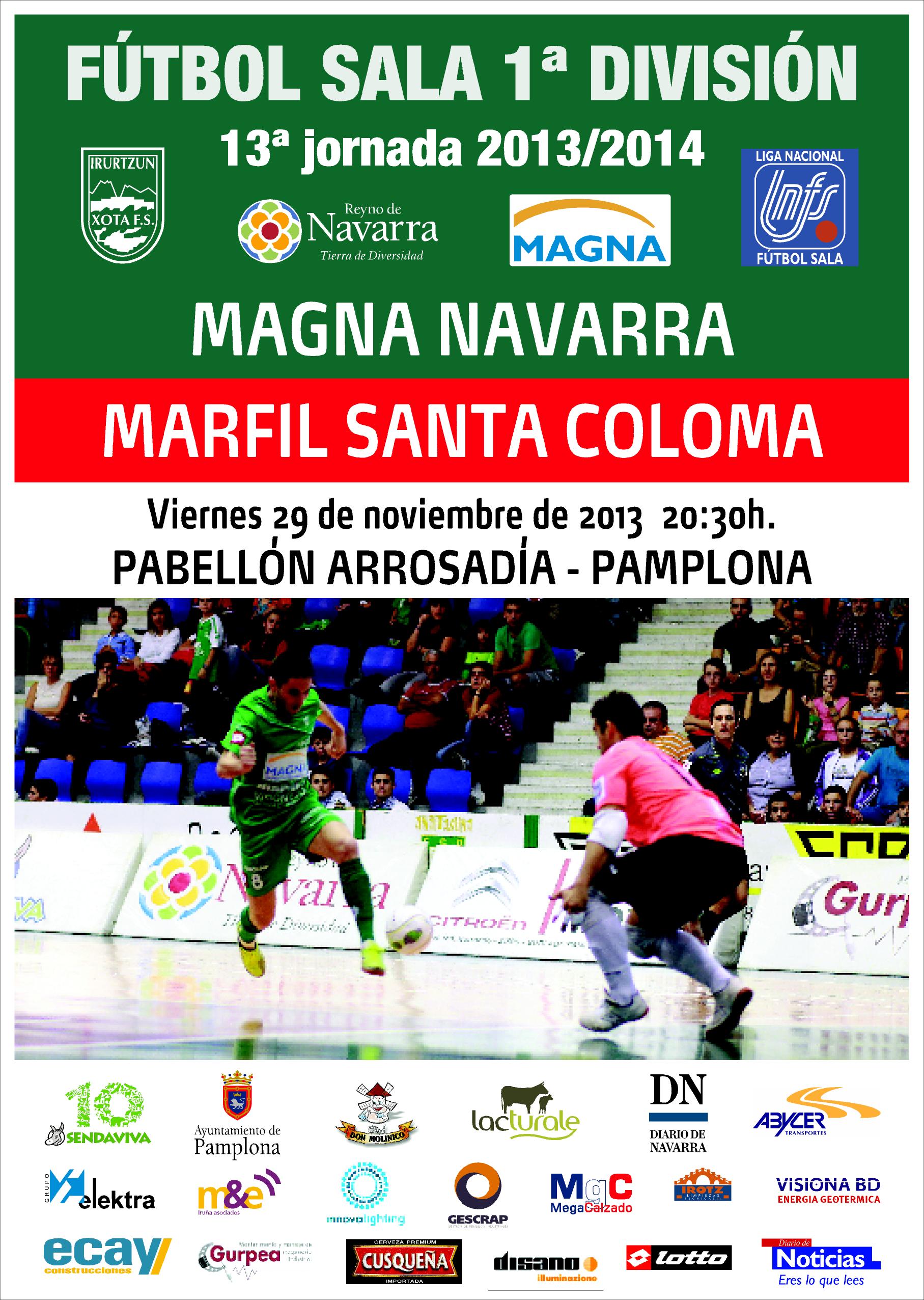 Magna Navarra juega por segunda vez consecutiva este viernes (20.30 h) en el Pabellón Arrosadía de Pamplona, su partido de liga ante el Marfil Santa Coloma. Duelo entre dos aspirantes claros a clasificarse para la fase final de la Copa de España que, recientemente se ha conocido que se celebrará en Logroño el próximo mes de marzo. Tres puntos decisivos sobre todo para el conjunto entrenado por Imanol Arregui que actualmente ocupa el octavo y último puesto de clasificación para esa competición. Marfil Santa Coloma tiene cuatro puntos más y dispone de un más amplio colchón para obtener su objetivo.