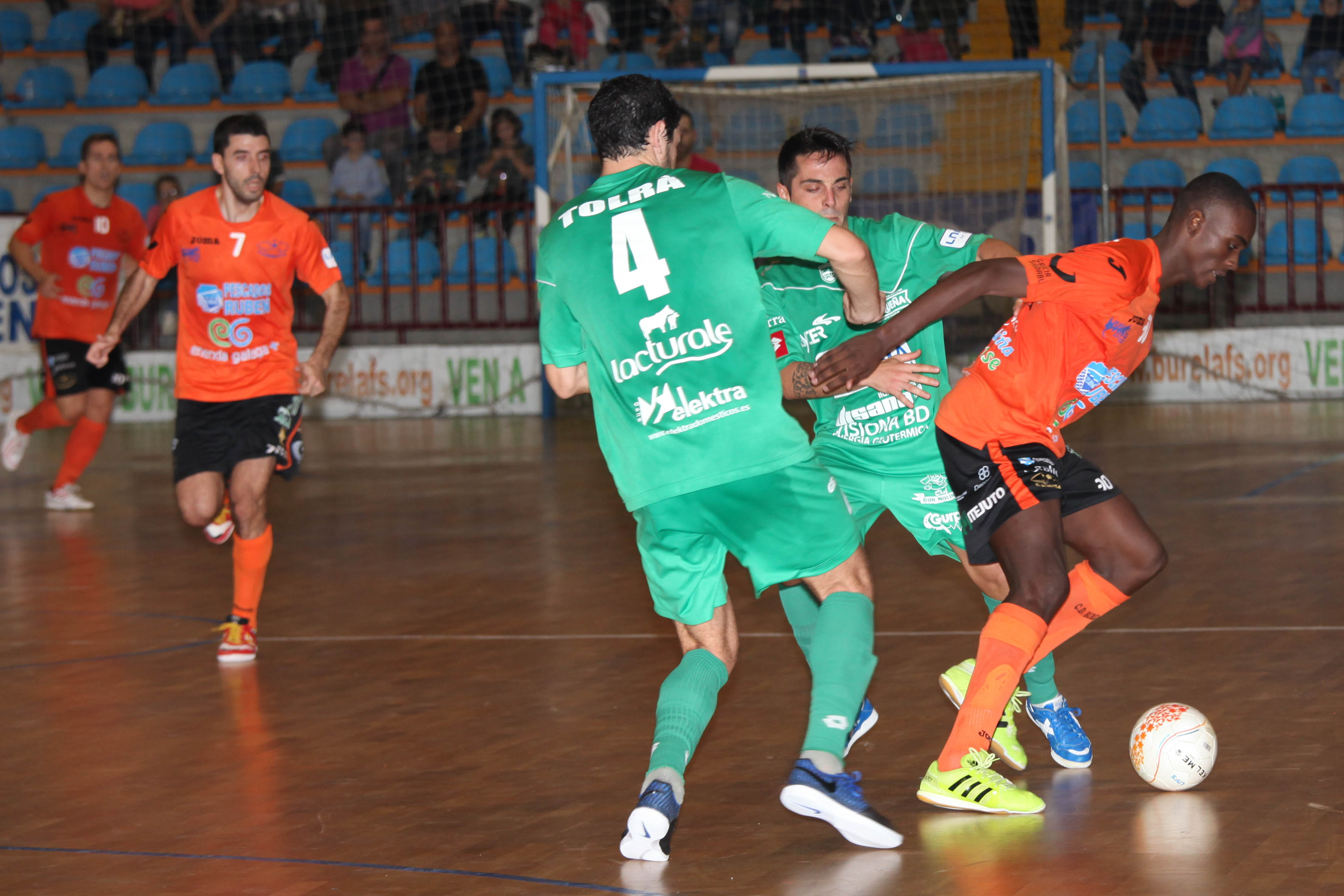 Emocionante encuentro el vivido en el pabellón lucense de Vista Alegre. Burela llegaba al choque con la urgencia de sumar sus segundos tres puntos, por lo que desde los primeros instantes los de Juanlu Alonso buscaron la meta defendida por Raúl sin crear demasiado peligro. Antes de llegar al ecuador del primer tiempo, Matamoros anotaba el 1-0 tras un gran pase de Isi. El jugador madrileño, de los más activos durante todo el encuentro, sería el encargado de ampliar distancias a favor de su equipo marcando el 2-0 en el minuto 10 en otro grave error de Magna. Los verdes tenían múltiples ocasiones pero se topaban con un gran Edu, portero local.