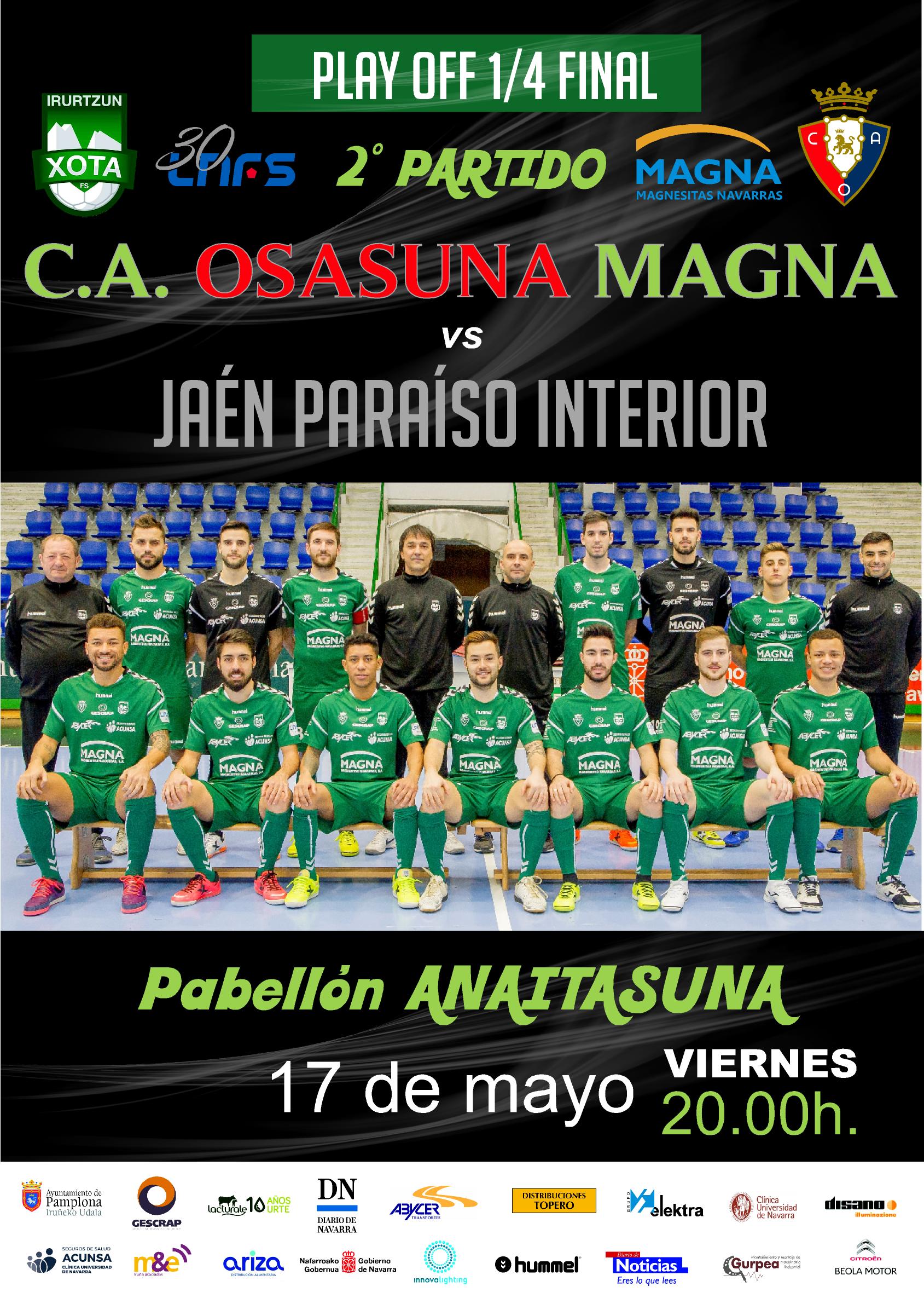 A partir del miércoles 15 de mayo, se podrán adquirir las entradas para el  partido de vuelta de los cuartos de final de los play off  que se disputa en el Pabellón Anaitasuna el viernes 17 de mayo (20 horas) entre C.A. Osasuna Magna y el Jaén Paraiso Interior. El encuentro no está incluido en el abono de temporada así que los abonados y patrocinadores deberán adquirir su entrada a precio reducido, teniendo preferencia en su adquisición. Los precios aprobados por la Junta Directiva del club han sido los siguientes: