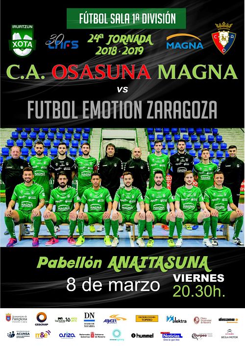 La competición no da respiro a la plantilla de C.A. Osasuna Magna que recibe este viernes a partir de las 20.30 horas en el Pabellón Anaitasuna al siempre exigente Fútbol Emotion Zaragoza. Los maños siguen teniendo posibilidades de clasificación para los play off y llegan a Pamplona con la intención de no descolgarse definitivamente de los ocho primeros. En lo que respecta al conjunto dirigido por Imanol Arregui, tras conseguir una nueva semifinal de la Copa de España, tratará de centrarse en la competición de liga para alargar su racha positiva y retener una jornada más el tercer puesto que actualmente ocupa en la tabla de clasificación.