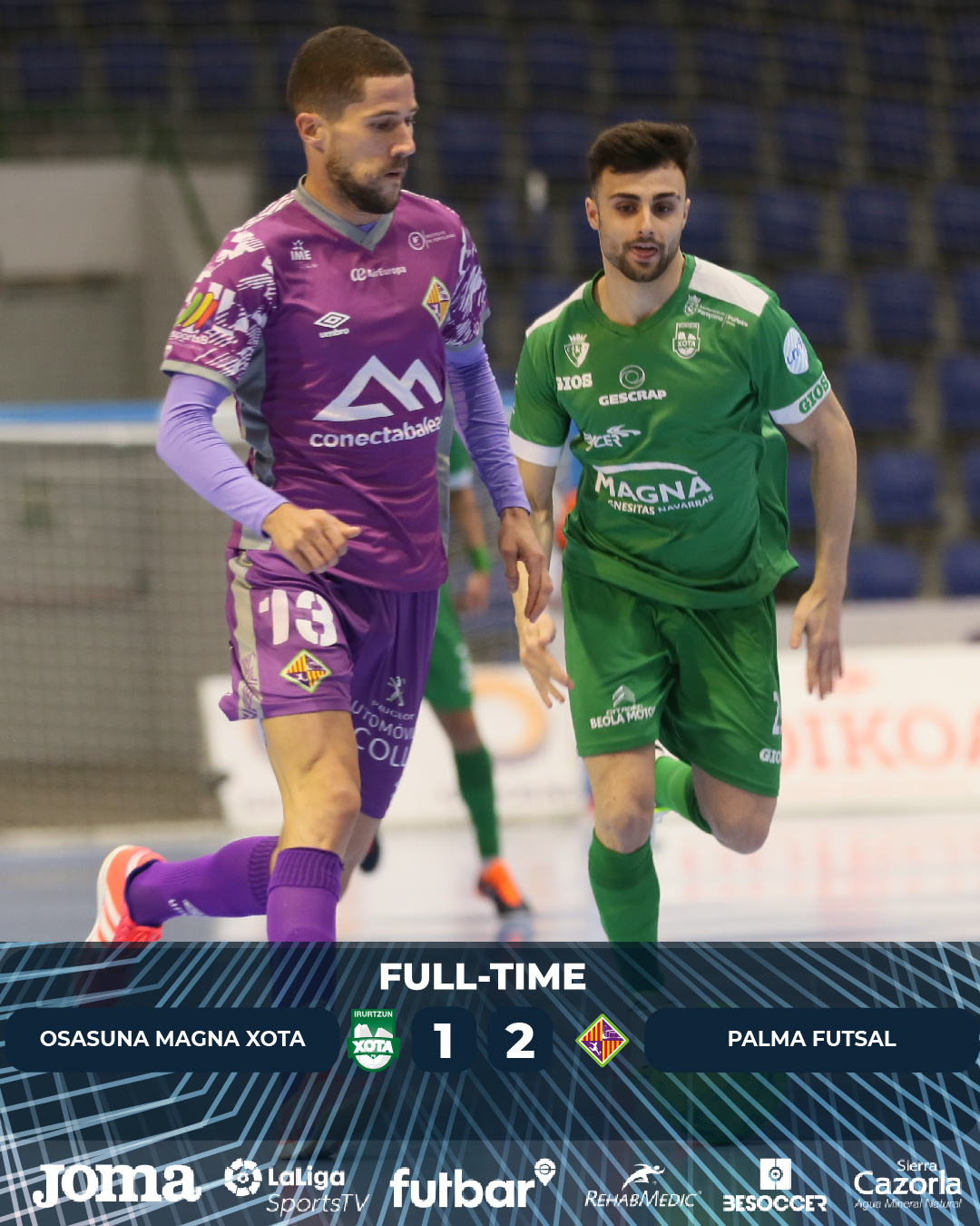 El empate era lo mas justo pero Osasuna Magna cayó ante Palma Futsa en un apasionante encuentro disputado en el Pabellón Anaitasuna. Ambos equipos iniciaron el partido con mucho respeto sobre el parqué de Anaitasuna, sin un dominador claro en los primeros compases del encuentro. El conjunto balear presionó arriba en la salida de balón a los navarros y dificultó la construcción del juego rival. César Velasco inició las hostilidades con una acción individual pero Carlos Barrón despejó el lanzamiento. Dani Zurdo probó fortuna desde fuera del área con un zurdazo que Carlos Barrón desbarató con una buena intervención. Raúl Campos también armó un zapatazo exterior ajustado al palo derecho de Asier pero el guardameta local desvió la trayectoria del balón a córner. En el minuto 14, Wanderson buscó el disparo directo de falta y el portero visitante despejó a córner. En el saque de esquina, Mancuso recibió el balón fuera del área y armó un zapatazo potente y preciso para enviar el balón al fondo de la red, haciendo imposible la parada de Barrón e inaugurando el marcador con el 1-0. Empataba Raúl Campos con una buena maniobra y disparo raso ajustado. Con el empate a un gol se llegó al descanso.