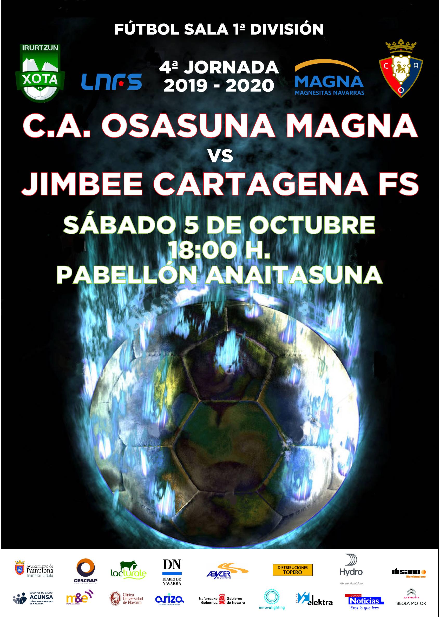 Este sábado 5 de octubre a partir de las 18 horas, se disputa el primero de los dos encuentros consecutivos que Osasuna Magna va a jugar como local en el Pabellón Anaitasuna. El visitante es el equipo Jimbee Cartagena que llega a Pamplona sin haber conseguido victoria alguna en las tres primera jornadas de liga, a pesar de tener una de las mejores plantillas de la competición con jugadores tan contratados como Batería, Eka, Juanpi, Ique o el viejo conocido de la afición de Osasuna Magna, Lukaian, que militó durante tres temporadas en el conjunto dirigido por Imanol Arregui y que ha vuelto a la liga española, diez temporadas después de su marcha del conjunto verde.