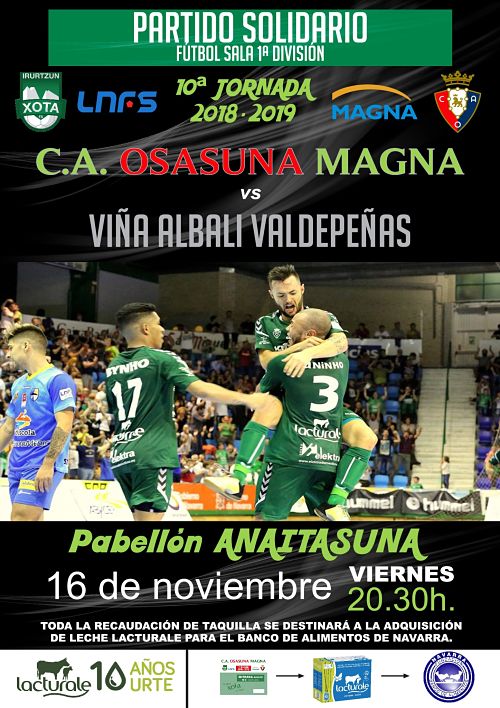 El próximo partido de liga que C.A. Osasuna Magna va a disputar en el Pabellón Anaitasuna el viernes 16 a las 20.30 horas, va a ser dedicado a una buena causa. Junto a Lacturale, se ha decidido colaborar con una entidad con el máximo prestigio, fiabilidad e importancia como es el Banco de Alimentos de Navarra. El importe íntegro de la taquilla del encuentro, correspondiente a la 10ª jornada de liga, será destinado a la compra de leche Lacturale que será donada al Banco de Alimentos como prólogo de su nueva Gran Recogida que la institución llevará a cabo los días 30 de noviembre y 1 de diciembre.