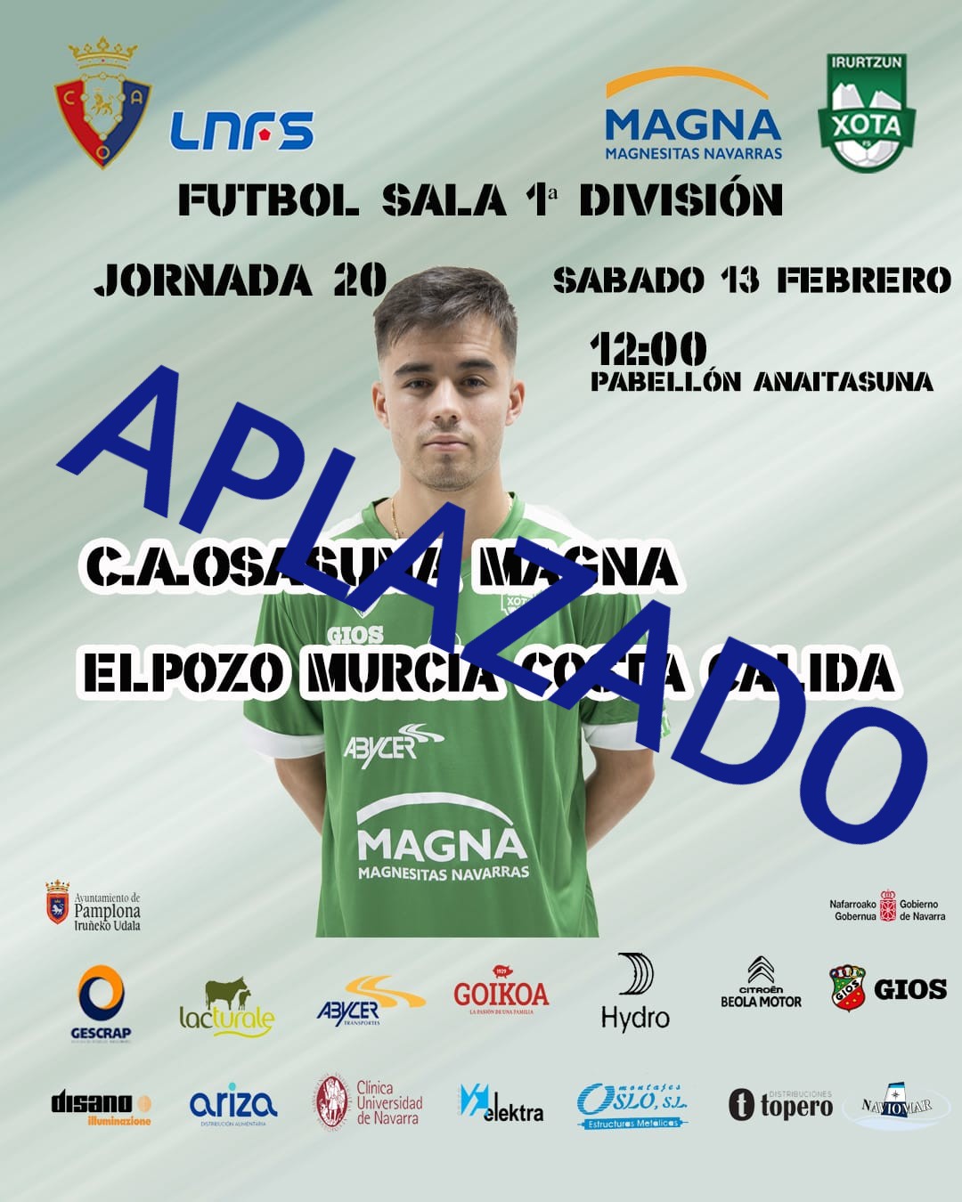 Por resolución del Juez de Competición, el partido de liga entre C.A. Osasuna Magna y ElPozo Murcia Costa Cálida ha quedado aplazado a una nueva fecha que se dará a conocer cuando el mismo juez lo decida. El equipo murciano tiene a varios jugadores en cuarentena por la detección de un positivo la pasada semana.