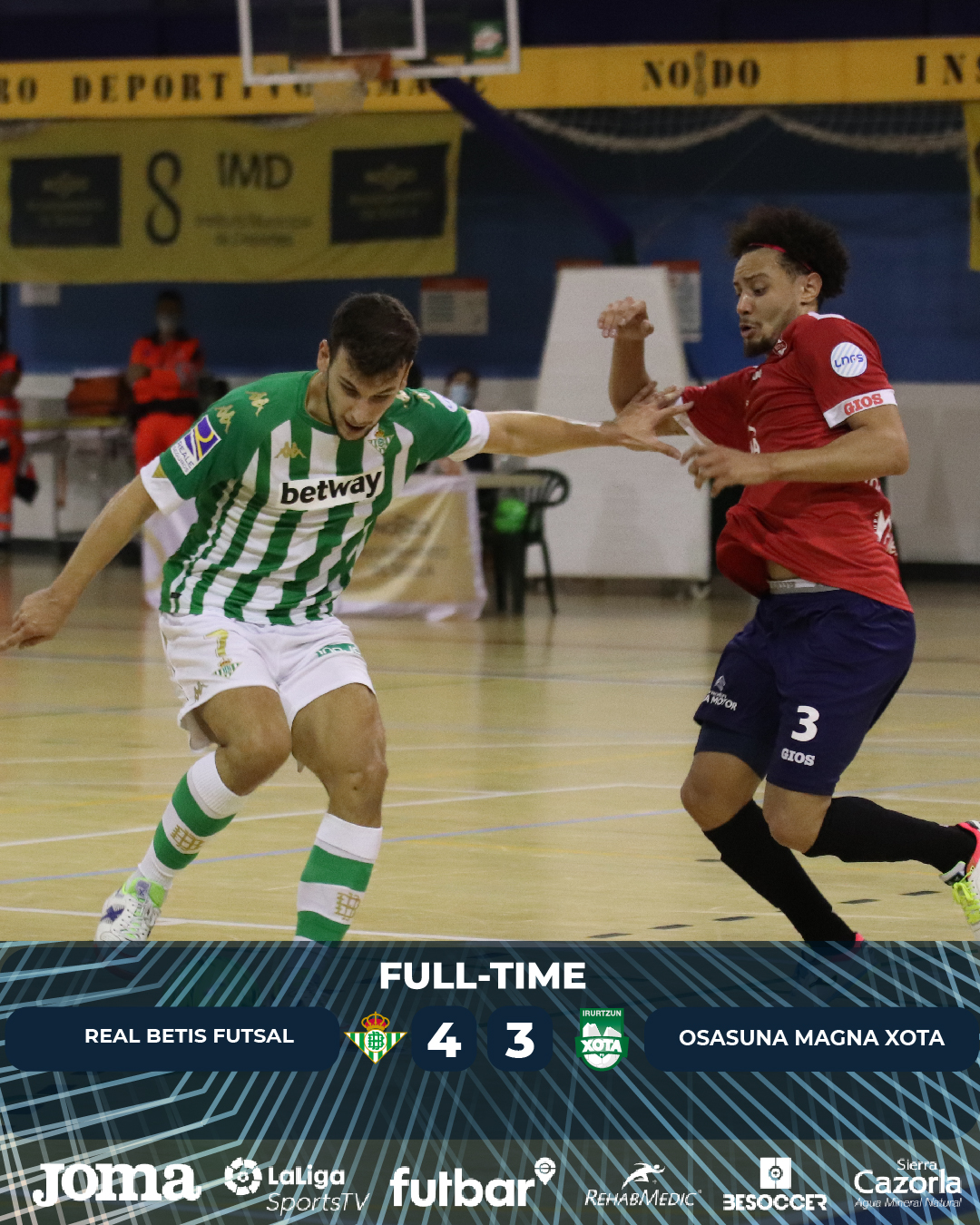 En el minuto 12, Chicho armó un zapatazo para poner el balón en la escuadra de Asier y establecer el 3-0 en el marcador. Dos minutos después, Burrito estuvo cerca de ampliar a cuatro los tantos de los béticos en un mano a mano que erró en la ejecución. Los de Imanol Arrregui intentaron rehacerse del arreón ofensivo de los béticos y Jesús envió el balón al larguero. En el minuto 18, Emilio Buendía volvió a ser protagonista al marcar el cuarto tanto para los locales, el segundo en su cuenta personal. Al borde del descanso, Osasuna Magna Xota dispuso de un doble penalti para reducir la desventaja y Wanderson consiguió anotar el 4-1 en el marcador.